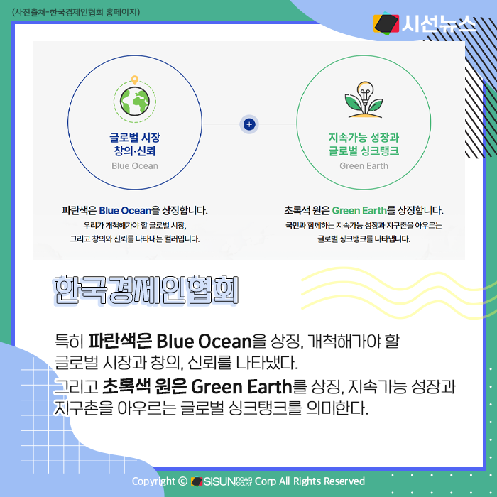 한국경제인협회 CI에도 그들의 기치가 담겨있다. 창립 정신과 전통을 계승하는 뜻에서 파랑과 녹색의 기본 색조는 바꾸지 않았고, 직선과 곡선이 조화를 이룬 서체를 통해서 젊고 유연한 사고를 표현해 변화에 대응하기 위한 자세를 담았다. 특히 파란색은 Blue Ocean을 상징, 개척해가야 할 글로벌 시장과 창의, 신뢰를 나타냈다. 그리고 초록색 원은 Green Earth를 상징, 지속가능 성장과 지구촌을 아우르는 글로벌 싱크탱크를 의미한다. 이처럼 한국경제인협회는 한국경제의 역동적인 미래를 담아, 과감한 변화와 지속적인 혁신으로 회원사와 함께, 국민과 정부와 함께, 한국경제의 글로벌 도약을 이끌어 가겠다는 방침이다.