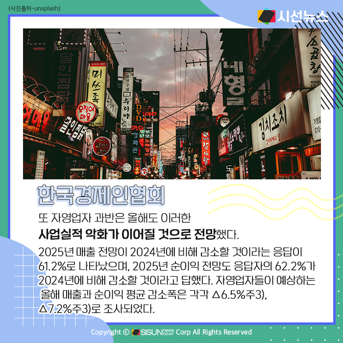 그렇다면, 한국 경제인들이 바라보는 2025년 우리 경제 전망은 어떨까? 한국경제인협회는 시장조사 전문기관인 모노리서치에 의뢰해 음식점업, 숙박업, 도・소매업, 기타서비스업 등 자영업자 500명을 대상으로 ‘자영업자 2024년 실적 및 2025년 전망 설문조사’를 실시했다.