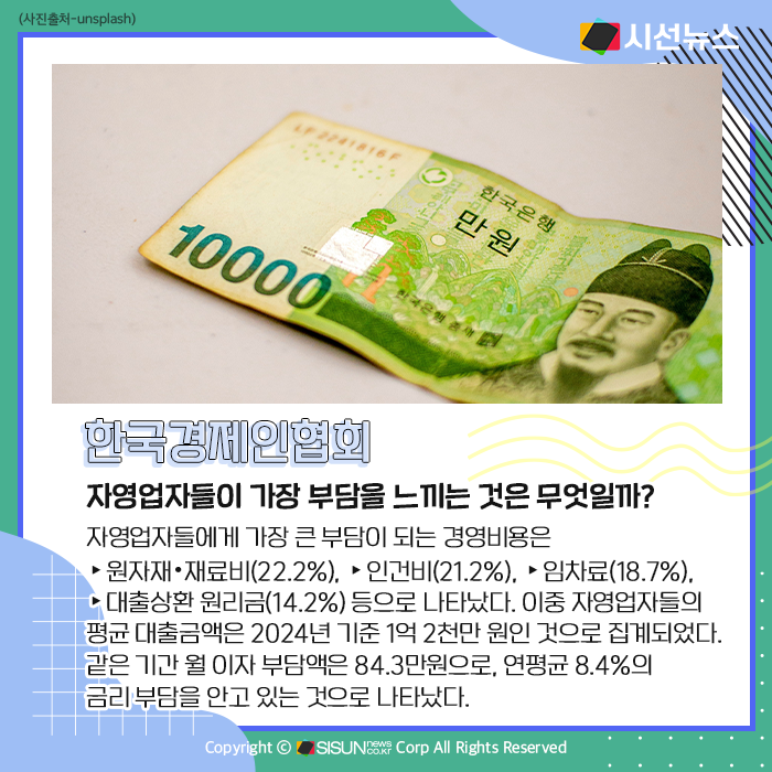 자영업자들이 가장 부담을 느끼는 것은 무엇일까? 자영업자들에게 가장 큰 부담이 되는 경영비용은 ▸원자재・재료비(22.2%), ▸인건비(21.2%), ▸임차료(18.7%), ▸대출상환 원리금(14.2%) 등으로 나타났다. 이중 자영업자들의 평균 대출금액은 2024년 기준 1억 2천만 원인 것으로 집계되었다. 같은 기간 월 이자 부담액은 84.3만원으로, 연평균 8.4%의 금리 부담을 안고 있는 것으로 나타났다.