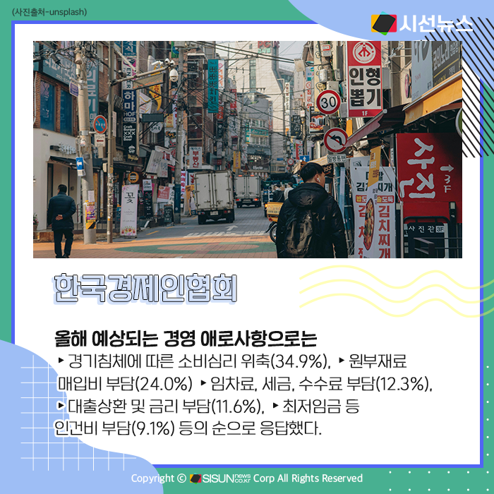 올해 예상되는 경영 애로사항으로는 ▸경기침체에 따른 소비심리 위축(34.9%), ▸원부재료 매입비 부담(24.0%) ▸임차료, 세금, 수수료 부담(12.3%), ▸대출상환 및 금리 부담(11.6%), ▸최저임금 등 인건비 부담(9.1%) 등의 순으로 응답했다.