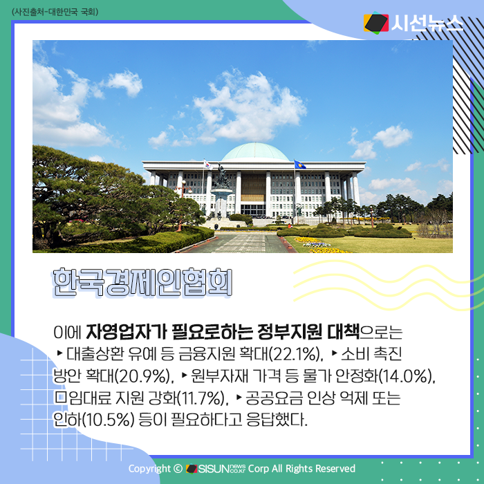이에 자영업자가 필요로하는 정부지원 대책으로는 ▸대출상환 유예 등 금융지원 확대(22.1%), ▸소비 촉진 방안 확대(20.9%), ▸원부자재 가격 등 물가 안정화(14.0%), ▸임대료 지원 강화(11.7%), ▸공공요금 인상 억제 또는 인하(10.5%) 등이 필요하다고 응답했다.