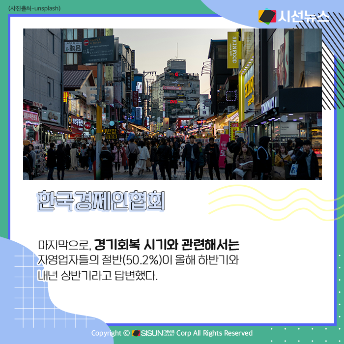 마지막으로, 경기회복 시기와 관련해서는 자영업자들의 절반(50.2%)이 올해 하반기와 내년 상반기라고 답변했다.