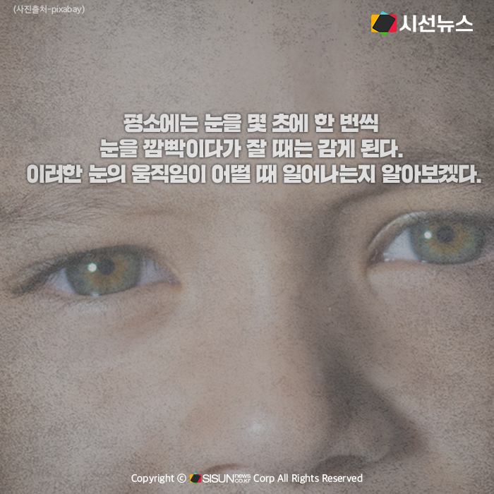 시선뉴스=정혜인 기자ㅣ시각, 청각, 후각, 미각, 촉각이라는 인간의 오감은 특정 자극을 신체에 전달하는 역할을 한다. 각기 감각을 담당하는 기관 모두 중요한 역할을 하며, 그중 눈은 시각 정보를 담당한다. 평소에는 눈을 몇 초에 한 번씩 눈을 깜빡이다가 잘 때는 감게 된다. 이러한 눈의 움직임이 어떨 때 일어나는지 알아보겠다.