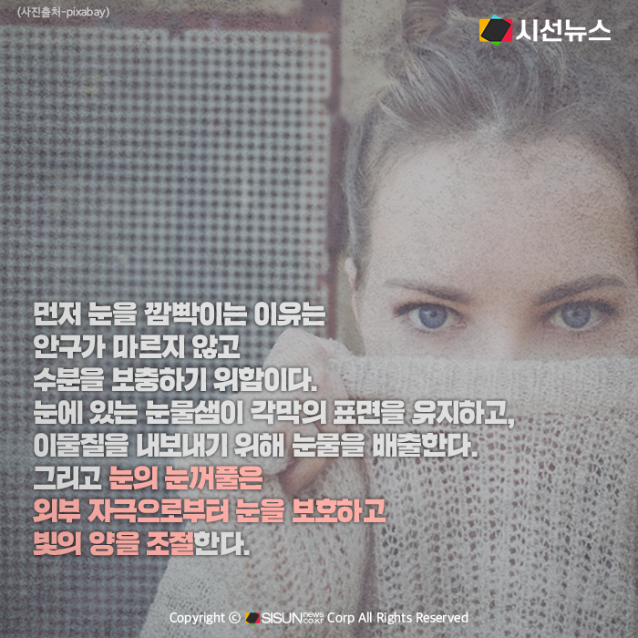 먼저 눈을 깜빡이는 이유는 안구가 마르지 않고 수분을 보충하기 위함이다. 눈에 있는 눈물샘이 각막의 표면을 유지하고, 이물질을 내보내기 위해 눈물을 배출한다. 그리고 눈의 눈꺼풀은 외부 자극으로부터 눈을 보호하고 빛의 양을 조절한다. 눈을 깜빡일 때는 눈물샘에서 분비한 소량의 눈물이 눈에 넓게 퍼지도록 한다.