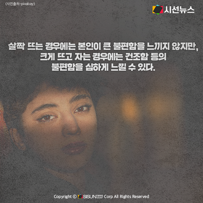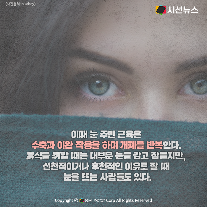 이때 눈 주변 근육은 수축과 이완 작용을 하며 개폐를 반복한다. 휴식을 취할 때는 대부분 눈을 감고 잠들지만, 선천적이거나 후천적인 이유로 잘 때 눈을 뜨는 사람들도 있다. 살짝 뜨는 경우에는 본인이 큰 불편함을 느끼지 않지만, 크게 뜨고 자는 경우에는 건조함 등의 불편함을 심하게 느낄 수 있다.
