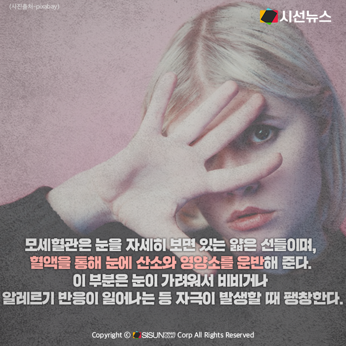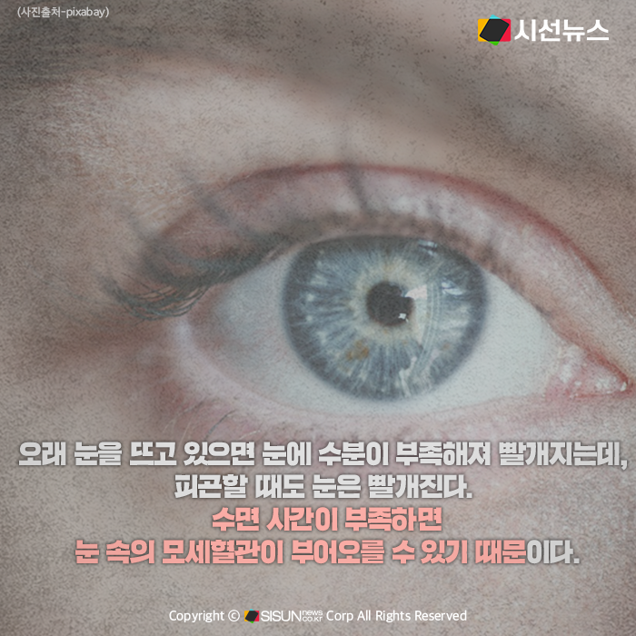오래 눈을 뜨고 있으면 눈에 수분이 부족해져 빨개지는데, 피곤할 때도 눈은 빨개진다. 수면 시간이 부족하면 눈 속의 모세혈관이 부어오를 수 있기 때문이다. 모세혈관은 눈을 자세히 보면 있는 얇은 선들이며, 혈액을 통해 눈에 산소와 영양소를 운반해 준다. 이 부분은 눈이 가려워서 비비거나 알레르기 반응이 일어나는 등 자극이 발생할 때 팽창한다.