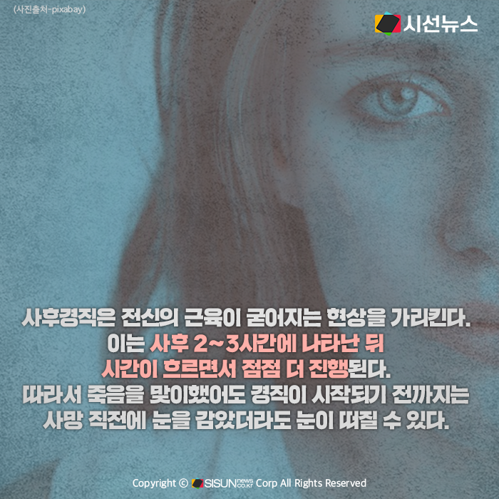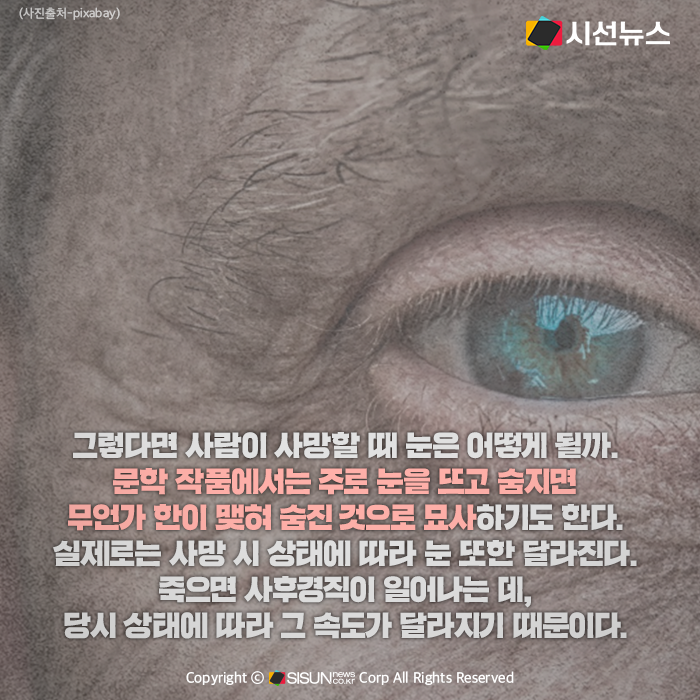그렇다면 사람이 사망할 때 눈은 어떻게 될까. 문학 작품에서는 주로 눈을 뜨고 숨지면 무언가 한이 맺혀 숨진 것으로 묘사하기도 한다. 실제로는 사망 시 상태에 따라 눈 또한 달라진다. 죽으면 사후경직이 일어나는 데, 당시 상태에 따라 그 속도가 달라지기 때문이다.