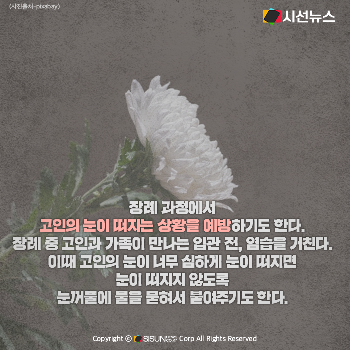 장례 과정에서 고인의 눈이 떠지는 상황을 예방하는 경우도 있는 것으로 알려졌다. 장례 중 고인과 가족이 만나는 입관 전에는 염습 과정을 거친다. 염습은 관에 들어가기 전 고인의 몸을 깨끗하게 하고 수의를 입히는 절차다. 이때 고인의 눈이 너무 심하게 눈이 떠지면 눈이 떠지지 않도록 눈꺼풀에 물을 묻혀서 붙여주기도 한다.