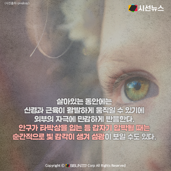 살아있는 동안에는 신경과 근육이 활발하게 움직일 수 있기에 외부의 자극에 민감하게 반응한다. 안구가 타박상을 입는 등 갑자기 압박될 때는 순간적으로 빛 감각이 생겨 섬광이 보일 수도 있다. 망막에 빛 이외의 물리적인 부적당자극이 작용할 때 순간적으로 생기는 빛 감각은 눈 섬광이라고 한다.