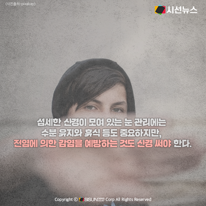 섬세한 신경이 모여 있는 눈 관리에는 수분 유지와 휴식 등도 중요하지만, 전염에 의한 감염을 예방하는 것도 신경 써야 한다. 특히 휴가철 사람이 많은 수영장에서는 유행하는 눈병을 옮을 수 있다. 사람이 많이 모이는 목욕탕 등의 장소를 피하는 것도 방법인데, 평소에는 손을 잘 씻는 게 가장 중요하다는 것을 기억하길 바란다.