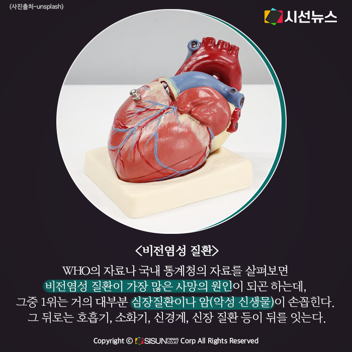 WHO의 자료나 국내 통계청의 자료를 살펴보면 비전염성 질환이 가장 많은 사망의 원인이 되곤 하는데, 그중에서도 1위는 거의 대부분 심장질환이나 암(악성 신생물)이 손꼽힌다. 그 뒤로는 호흡기, 소화기, 신경계, 신장 질환 등이 뒤를 잇는다.