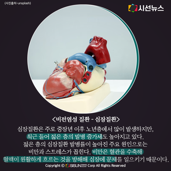 심장질환은 주로 중장년 이후 노년층에서 많이 발생하지만, 최근 들어 젊은 층의 발병 증가세도 높아지고 있다. 젊은 층의 심장질환 발병률이 높아진 주요 원인으로는 비만과 스트레스가 꼽힌다. 비만은 혈관을 수축해 혈액이 원활하게 흐르는 것을 방해해 심장에 문제를 일으키기 때문이다.