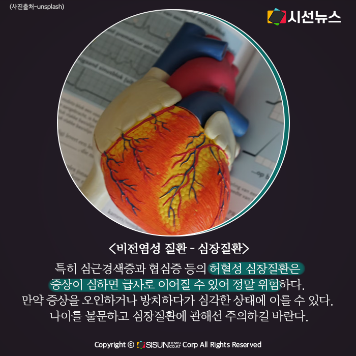 특히 심근경색증과 협심증 등 심장이 제대로 피를 공급받지 못해 생기는 허혈성 심장질환은 증상이 심하면 급사로 이어질 수 있어 정말 위험하다. 나이가 젊을수록 심장질환에 대한 경각심이 낮다 보니 증상을 오인하거나 방치하다가 심각한 상태에 이를 수 있다. 나이를 불문하고 심장질환에 관해선 주의하길 바란다.