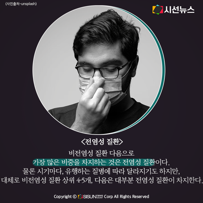 비전염성 질환 다음으로 가장 많은 비중을 차지하는 것은 전염성 질환이다. 물론 시기마다, 유행하는 질병에 따라 달라지기도 하지만, 대체로 비전염성 질환 상위 4-5개 다음엔 전염성 질환의 대부분이 차지한다.
