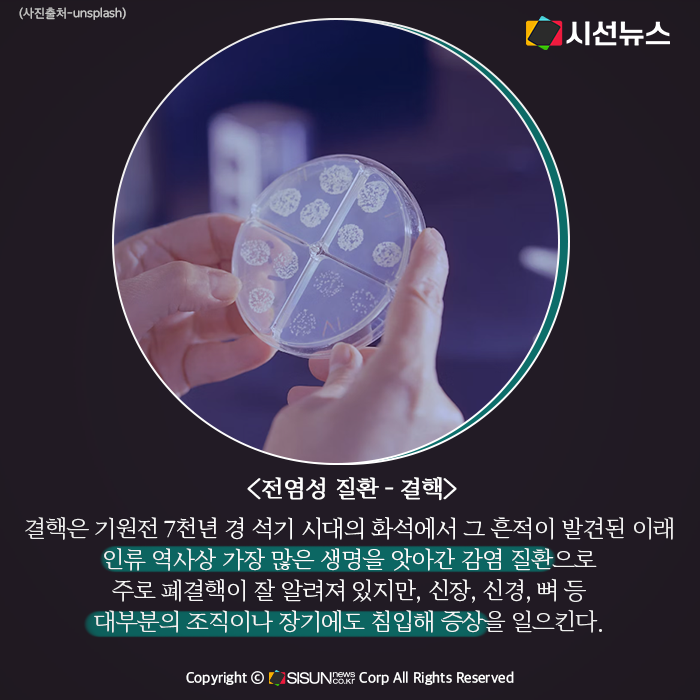 결핵은 기원전 7천년 경 석기 시대의 화석에서 그 흔적이 발견된 이래 인류 역사상 가장 많은 생명을 앗아간 감염 질환으로 주로 폐결핵이 잘 알려져 있지만, 신장, 신경, 뼈 등 대부분의 조직이나 장기에도 침입해 증상을 일으킨다.
