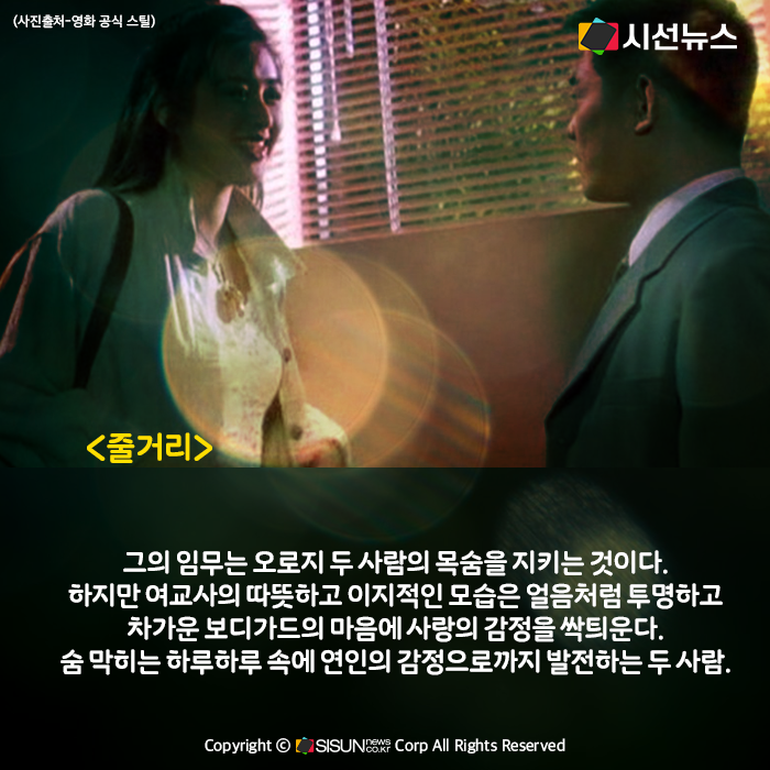 시선뉴스=박진아 기자ㅣ가족과 함께 할 때, 혼자서 울고 싶을 때, 사랑하는 연인과 로맨스를 한껏 더 즐기고 싶을 때, 당신은 어떤 영화를 선택하나요? 많은 영화들 속에서 결정을 내리기 어려운 당신에게 영화를 추천, 요리합니다. 오늘의 영화는 ‘보디가드(中南海保鑣, The Bodyguard From Beijing, 1994)’입니다.