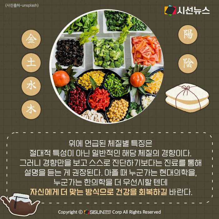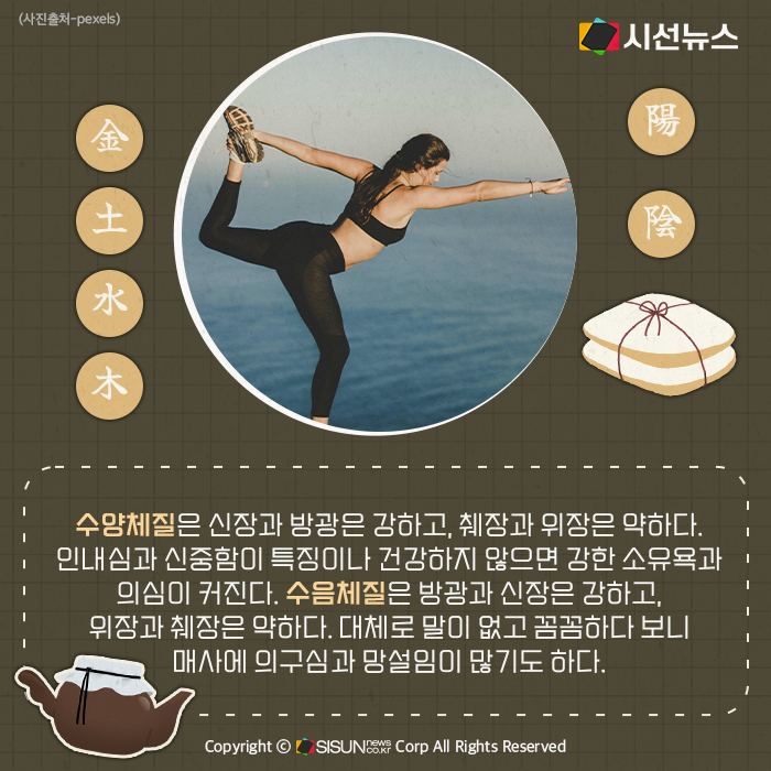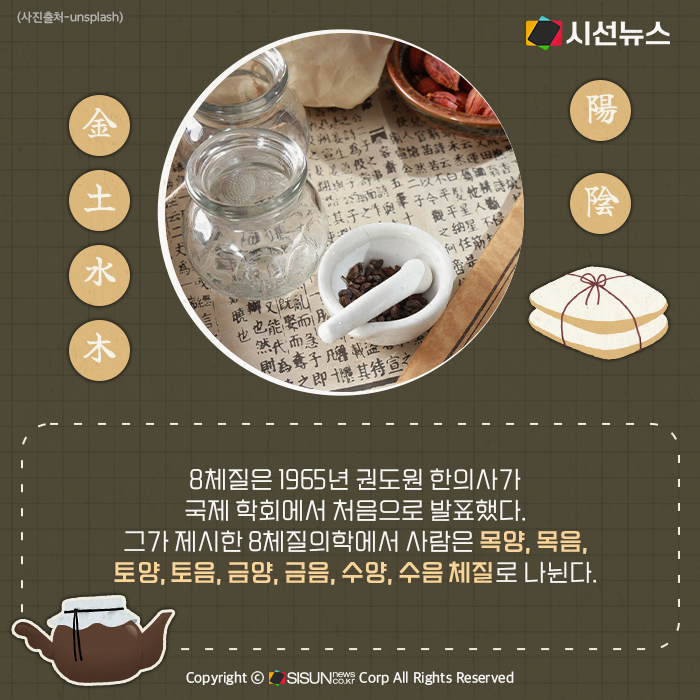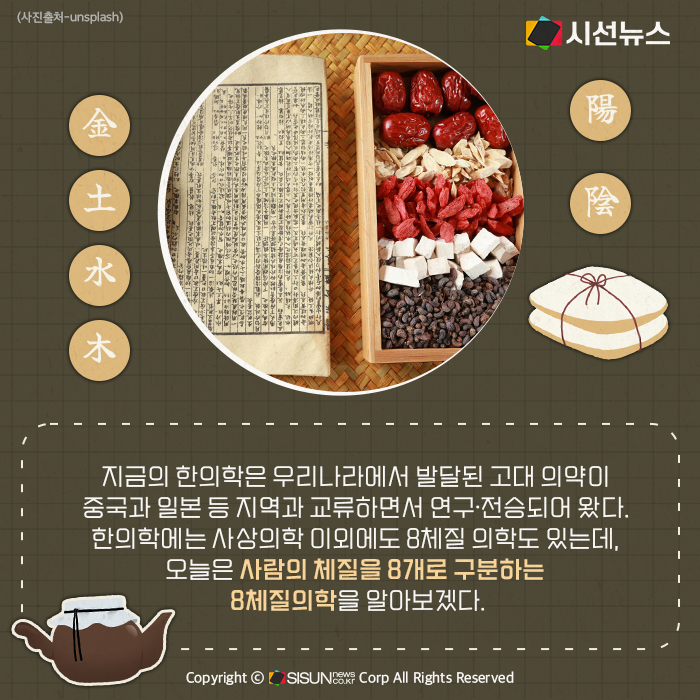 시선뉴스=정혜인 기자 / 디자인=김선희 proㅣ지금의 한의학은 우리나라에서 발달된 고대 의약이 중국과 일본 등 지역과 교류하면서 연구·전승되어 왔다. 사람의 체질을 4개로 구분하는 사상의학이 한의학 체계 중 하나다. 이보다 더 세부적으로 구분하는 8체질 의학도 있는데, 오늘은 사람의 체질을 8개로 구분하는 8체질의학을 알아보겠다.