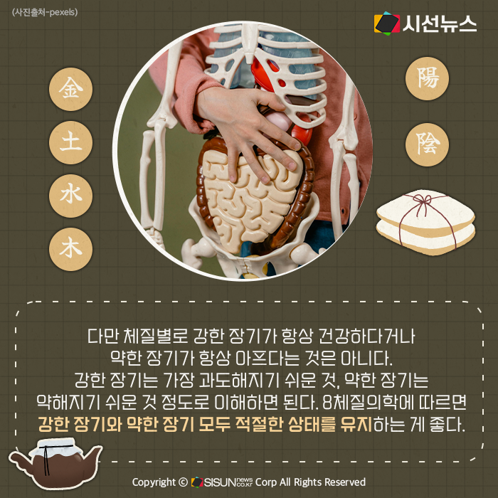 다만 체질별로 강한 장기가 항상 건강하다거나 약한 장기가 항상 아프다는 것은 아니다. 강한 장기는 가장 과도해지기 쉬운 것, 약한 장기는 약해지기 쉬운 것 정도로 이해하면 된다. 8체질의학에 따르면 강한 장기와 약한 장기 모두 과하거나 부족하지 않게 적절한 상태를 유지하는 게 좋다.