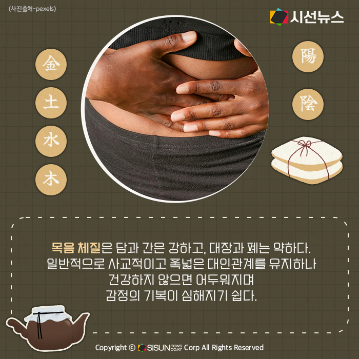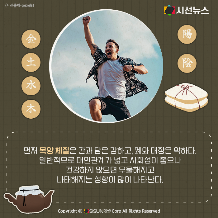 먼저 목양 체질은 간과 담은 강하고, 폐와 대장은 약하다. 일반적으로 대인관계가 넓고 사회성이 좋으나 건강하지 않으면 우울해지고 나태해지는 성향이 많이 나타난다. 목음 체질은 담과 간은 강하고, 대장과 폐는 약하다. 일반적으로 사교적이고 폭넓은 대인관계를 유지하나 건강하지 않으면 어두워지며 감정의 기복이 심해지기 쉽다.