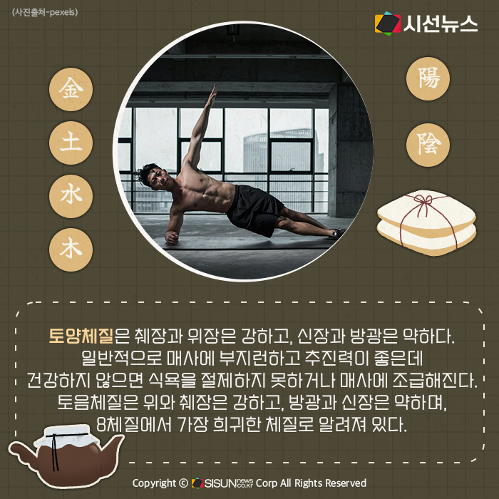 토양체질은 췌장과 위장은 강하고, 신장과 방광은 약하다. 일반적으로 매사에 부지런하고 추진력이 좋은데 건강하지 않으면 식욕을 절제하지 못하거나 매사에 조급해진다. 토음체질은 위와 췌장은 강하고, 방광과 신장은 약하며, 8체질에서 가장 희귀한 체질로 알려져 있다.
