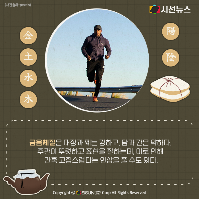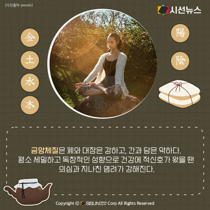 금양체질은 폐와 대장은 강하고, 간과 담은 약하다. 평소 세밀하고 독창적인 성향으로 건강에 적신호가 왔을 땐 의심과 지나친 염려가 강해진다. 금음체질은 대장과 폐는 강하고, 담과 간은 약하다. 주관이 뚜렷하고 표현을 잘하는데, 이로 인해 간혹 고집스럽다는 인상을 줄 수도 있다.