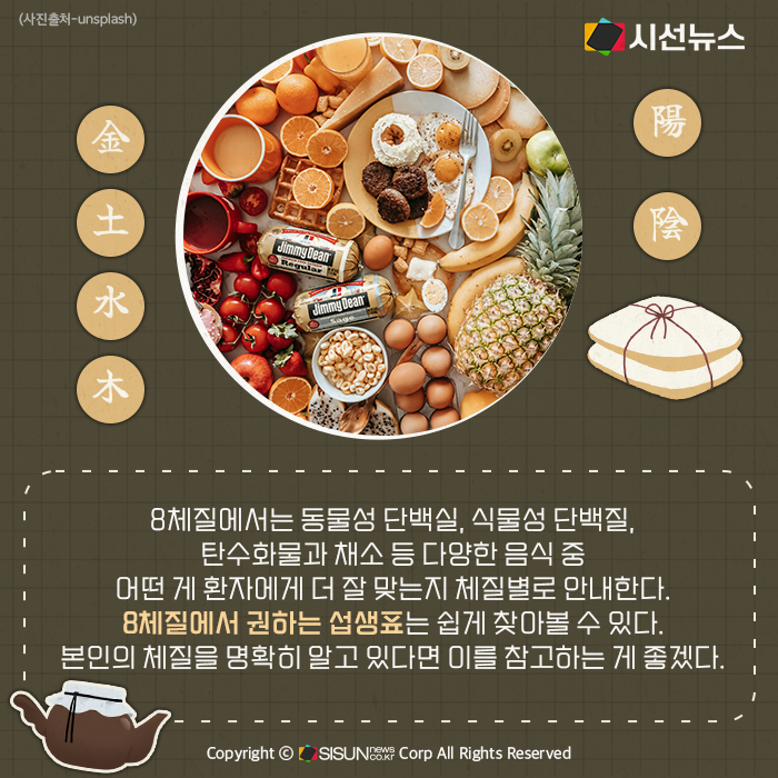 8체질에서는 동물성 단백실, 식물성 단백질, 탄수화물과 채소 등 다양한 음식 중 어떤 게 환자에게 더 잘 맞는지 체질별로 안내한다. 8체질에서 권하는 섭생표는 쉽게 찾아볼 수 있다. 본인의 체질을 명확히 알고 있다면 이를 참고하는 게 좋겠다.