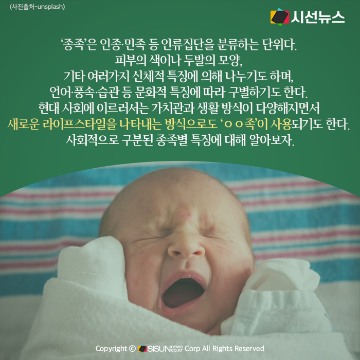 시선뉴스=양원민 기자ㅣ‘종족’은 인종·민족 등 인류집단을 분류하는 단위다. 피부의 색이나 두발의 모양, 기타 여러가지 신체적 특징에 의해 나누기도 하며, 언어·풍속·습관 등 문화적 특징에 따라 구별하기도 한다. 현대 사회에 이르러서는 가치관과 생활 방식이 다양해지면서 새로운 라이프스타일을 나타내는 방식으로도 ‘ㅇㅇ족’이 사용되기도 한다. 사회적으로 구분된 종족별 특징에 대해 알아보자.