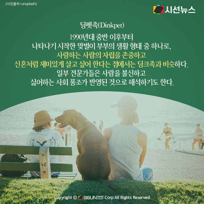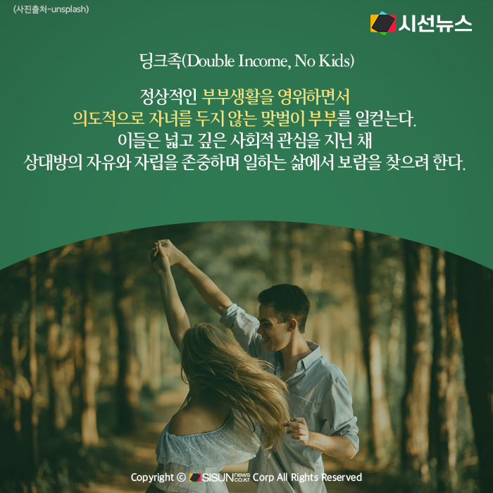 정상적인 부부생활을 영위하면서 의도적으로 자녀를 두지 않는 맞벌이 부부를 일컫는다. 이들은 넓고 깊은 사회적 관심을 지닌 채 상대방의 자유와 자립을 존중하며 일하는 삶에서 보람을 찾으려 한다.