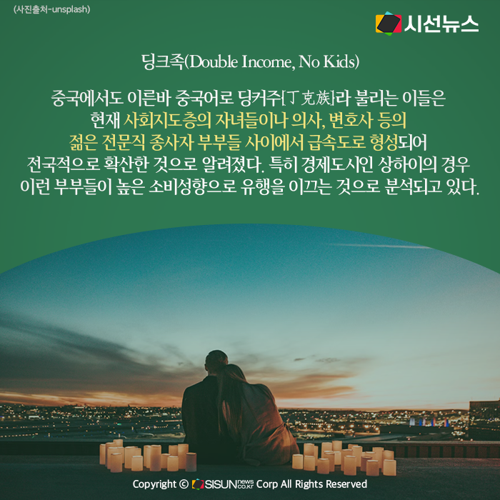 중국에서도 이른바 중국어로 딩커주[丁克族]라 불리는 이들은 현재 사회지도층의 자녀들이나 의사, 변호사 등의 젊은 전문직 종사자 부부들 사이에서 급속도로 형성되어 전국적으로 확산한 것으로 알려졌다. 특히 경제도시인 상하이의 경우 이런 부부들이 높은 소비성향으로 유행을 이끄는 것으로 분석되고 있다.