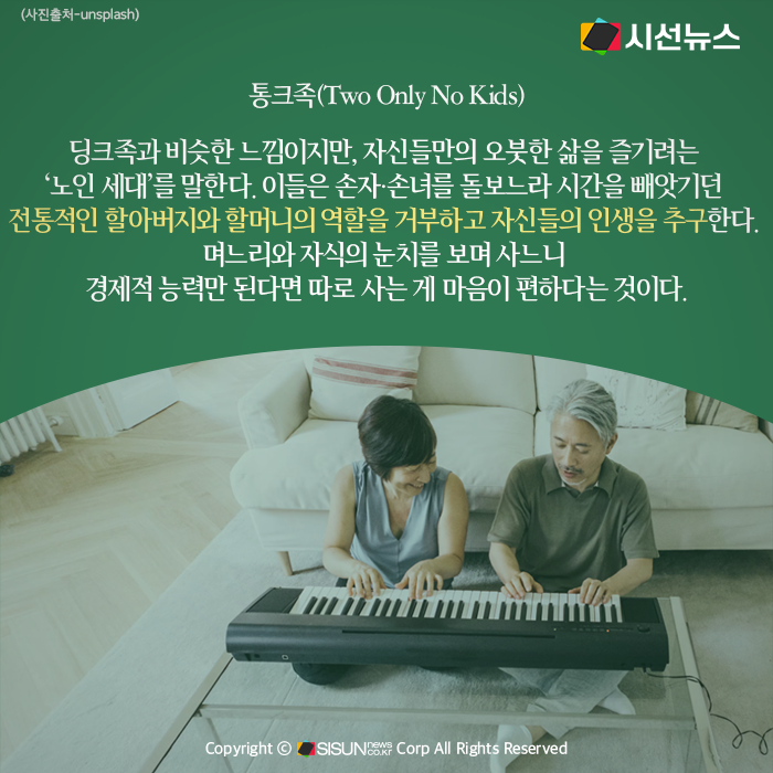 영어 뜻만 놓고 보면 딩크족과 비슷한 느낌이지만, 자신들만의 오붓한 삶을 즐기려는 ‘노인 세대’를 말한다. 이들은 손자·손녀를 돌보느라 시간을 빼앗기던 전통적인 할아버지와 할머니의 역할을 거부하고 자신들만의 인생을 추구한다. 며느리와 자식의 눈치를 보며 사느니 경제적 능력만 된다면 따로 사는 게 마음이 편하다는 것이다.