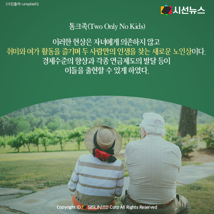 이러한 현상은 자녀에게 의존하지 않고 취미와 여가 활동을 즐기며 두 사람만의 인생을 찾는 새로운 노인상이다. 경제수준의 향상과 각종 연금제도의 발달 등이 이들을 출현할 수 있게 하였다.