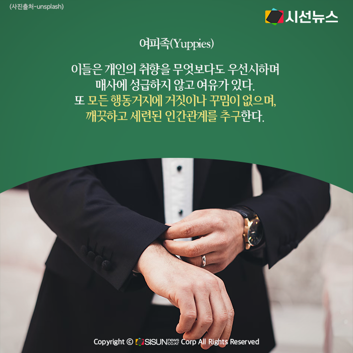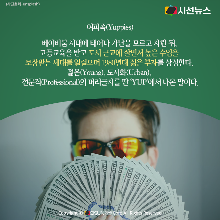 베이비붐 시대에 태어나 가난을 모르고 자란 뒤, 고등교육을 받고 도시 근교에 살면서 높은 수입을 보장받는 세대를 일컬으며 1980년대 젊은 부자를 상징한다. 젊은(Young), 도시화(Urban), 전문직(Professional)의 머리글자를 딴 ‘YUP’에서 나온 말이다.