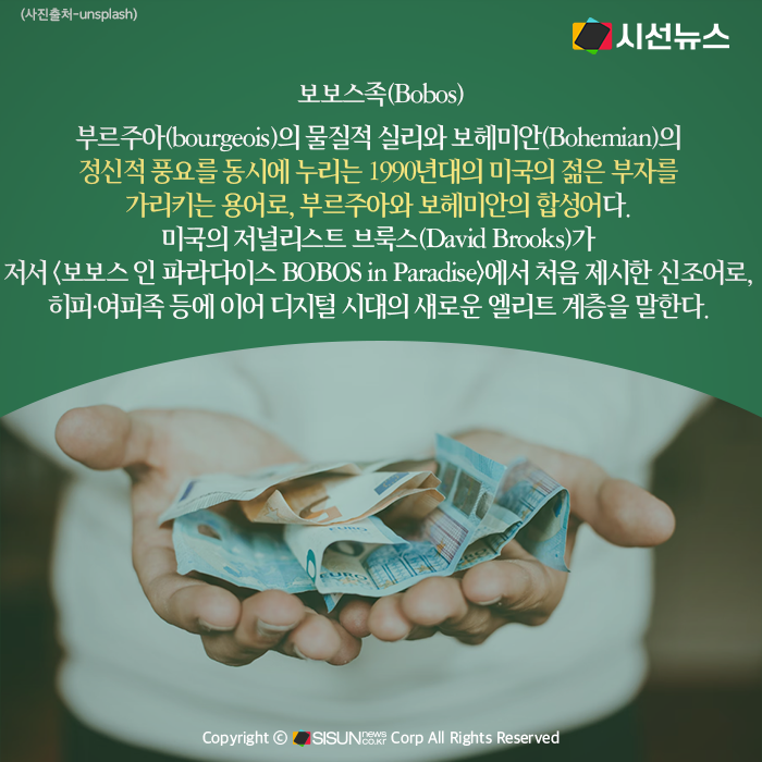 부르주아(bourgeois)의 물질적 실리와 보헤미안(Bohemian)의 정신적 풍요를 동시에 누리는 1990년대의 미국의 젊은 부자를 가리키는 용어로, 부르주아와 보헤미안의 합성어다. 미국의 저널리스트 브룩스(David Brooks)가 저서 <보보스 인 파라다이스 BOBOS in Paradise>에서 처음 제시한 신조어로, 히피·여피족 등에 이어 디지털 시대의 새로운 엘리트로 부상한 계층을 말한다.