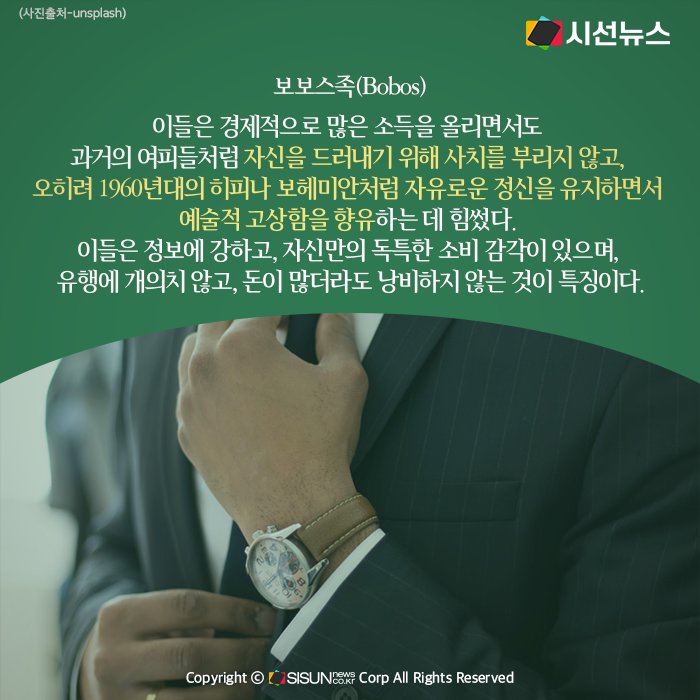 이들은 경제적으로 많은 소득을 올리면서도 과거의 여피들처럼 자신을 드러내기 위해 사치를 부리지 않고, 오히려 1960년대의 히피나 보헤미안처럼 자유로운 정신을 유지하면서 예술적 고상함을 향유하는 데 힘썼다. 이들은 정보에 강하고, 자신만의 독특한 소비 감각이 있으며, 유행에 개의치 않고, 돈이 많더라도 낭비하지 않는 것이 특징이다.