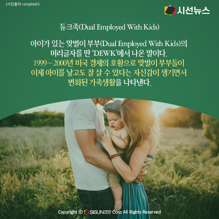아이가 있는 맞벌이 부부(Dual Employed With Kids)의 머리글자를 딴 ‘DEWK’에서 나온 말이다. 1999∼2000년 미국 경제의 호황으로 맞벌이 부부들이 이제 아이를 낳고도 잘 살 수 있다는 자신감이 생기면서 변화된 가족생활을 나타낸다.
