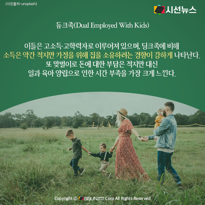 이들은 고소득·고학력자로 이루어져 있으며, 딩크족에 비해 소득은 약간 적지만 가정을 위해 집을 소유하려는 경향이 강하게 나타난다. 또 맞벌이로 돈에 대한 부담은 적지만 대신 일과 육아 양립으로 인한 시간 부족을 가장 크게 느낀다.
