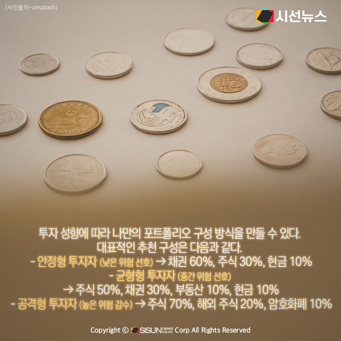 - 안정형 투자자 (낮은 위험 선호) → 채권 60%, 주식 30%, 현금 10%
