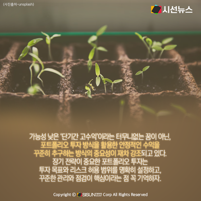가능성 낮은 ‘단기간 고수익’이라는 터무니없는 꿈이 아닌, 포트폴리오 투자 방식을 활용한 안정적인 수익을 꾸준히 추구하는 방식의 중요성이 재차 강조되고 있다. 장기 전략이 중요한 포트폴리오 투자는 투자 목표와 리스크 허용 범위를 명확히 설정하고, 꾸준한 관리와 점검이 핵심이라는 점 꼭 기억하자.