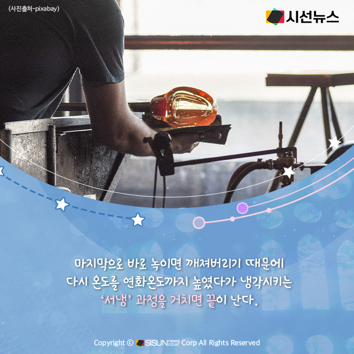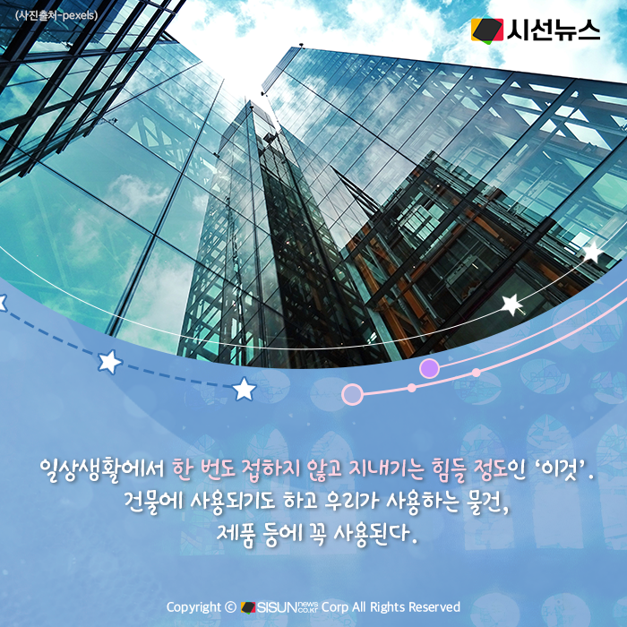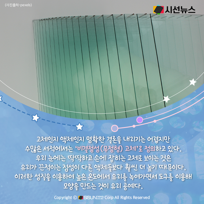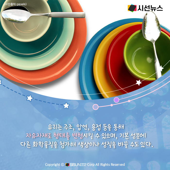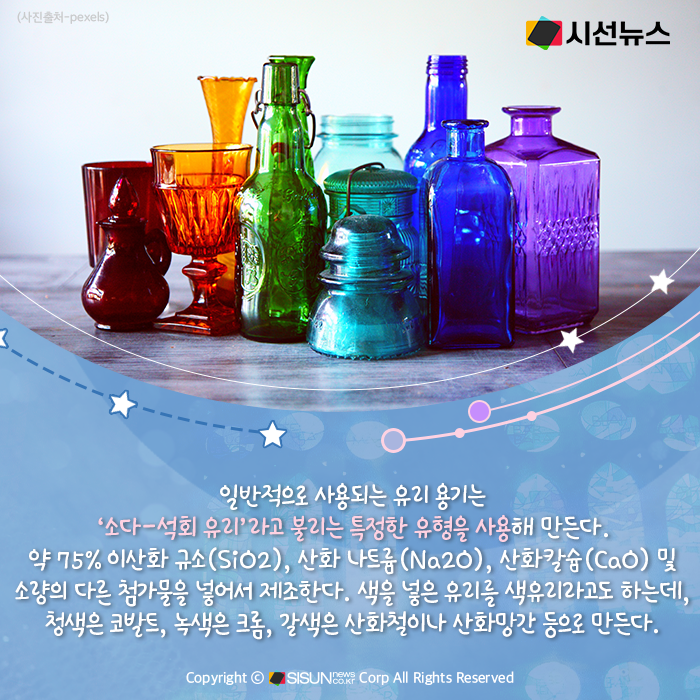시선뉴스=박진아 기자 / 디자인=김선희 proㅣ일상생활에서 한 번도 접하지 않고 지내기는 힘들 정도인 ‘이것’. 건물에 사용되기도 하고 우리가 사용하는 물건, 제품 등에 꼭 사용된다. 특유의 투광성, 다양하고 임의로운 색채의 발현성 등의 특성을 가지고 있어 옛날부터 제조되어 왔고 귀중하게 다뤄져 왔다. 단단하지만 유연성은 거의 없어 쉽게 깨지는 특성을 가지고 있는, ‘유리’에 대해 알아본다.
