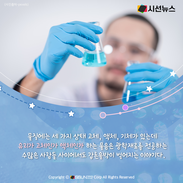 물질에는 세 가지 상태 고체, 액체, 기체가 있는데 유리가 고체인가 액체인가 하는 물음은 광학재료를 전공하는 수많은 사람들 사이에서도 갑론을박이 벌어지는 이야기다.
