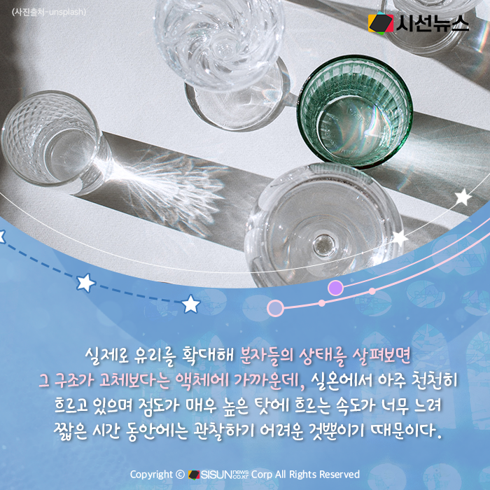 실제로 유리를 확대해 분자들의 상태를 살펴보면 그 구조가 고체보다는 액체에 가까운데, 실온에서 아주 천천히 흐르고 있으며 점도가 매우 높은 탓에 흐르는 속도가 너무 느려 짧은 시간 동안에는 관찰하기 어려운 것뿐이기 때문이다.
