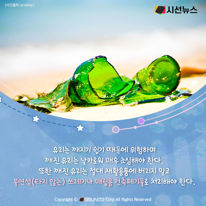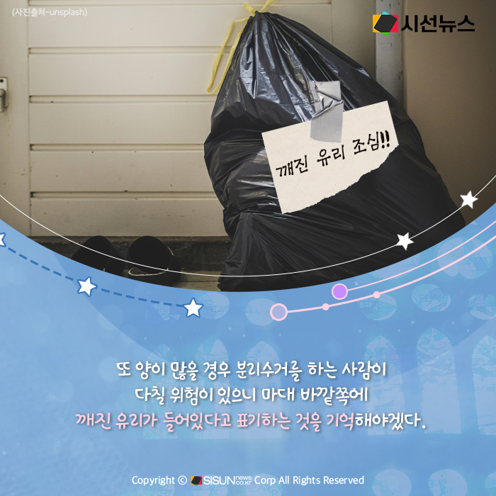 유리는 깨지기 쉽기 때문에 위험하며 깨진 유리는 날카로워 매우 조심해야 한다. 또한 깨진 유리는 절대 재활용품에 버리지 말고 불연성(타지 않는) 쓰레기나 매립용 건축폐기물로 처리해야 한다. 또 양이 많을 경우 분리수거를 하는 사람이 다칠 위험이 있으니 마대 바깥쪽에 깨진 유리가 들어있다고 표기하는 것을 기억해야겠다.