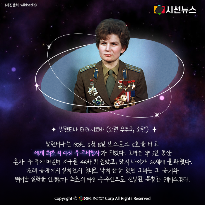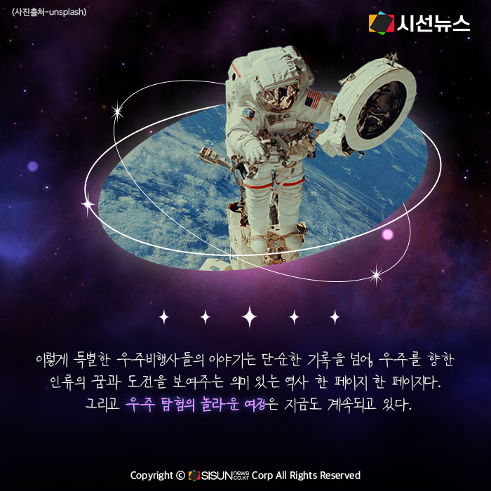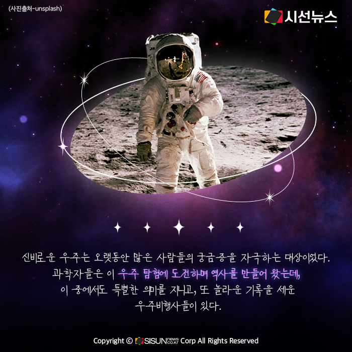 시선뉴스=심재민 기자 / 디자인=김선희 pro | 신비로운 우주는 오랫동안 많은 사람들의 궁금증을 자극하는 대상이었다. 과학자들은 이 우주 탐험에 도전하며 역사를 만들어 왔는데, 이 중에서도 특별한 의미를 지니고, 또 놀라운 기록을 세운 우주비행사들이 있다.