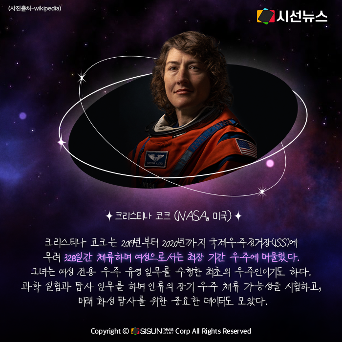 크리스티나 코크는 2019년부터 2020년까지 국제우주정거장(ISS)에 무려 328일간 체류하며 여성으로서는 최장 기간 우주에 머물렀다. 그녀는 여성 전용 우주 유영 임무를 수행한 최초의 우주인이기도 하다. 과학 실험과 탐사 임무를 하며 인류의 장기 우주 체류 가능성을 시험하고, 미래 화성 탐사를 위한 중요한 데이터도 모았다.