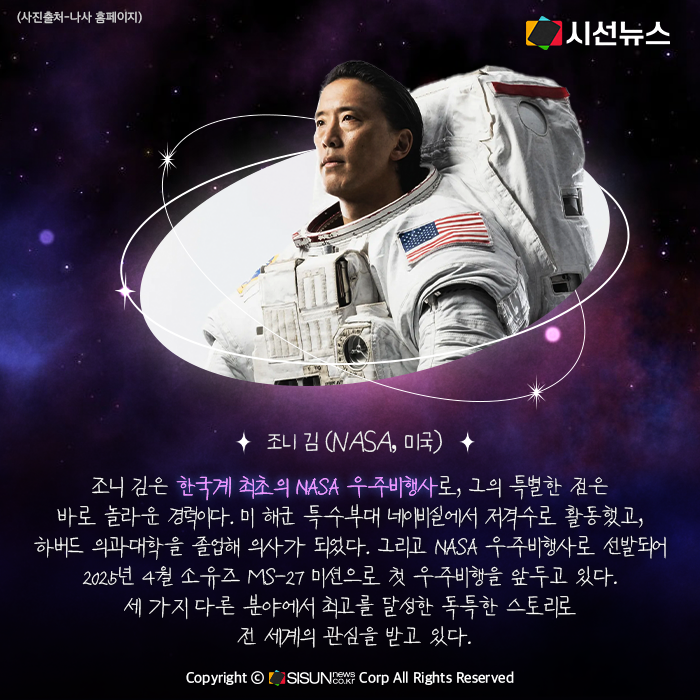 조니 김은 한국계 최초의 NASA 우주비행사로, 그의 특별한 점은 바로 놀라운 경력이다. 미 해군 특수부대 네이비실에서 저격수로 활동했고, 그 후 하버드 의과대학을 졸업해 의사가 되었다. 그리고 NASA 우주비행사로 선발되어 2025년 4월 소유즈 MS-27 미션으로 첫 우주비행을 앞두고 있다. 세 가지 다른 분야에서 최고를 달성한 독특한 스토리로 전 세계의 관심을 받고 있다.