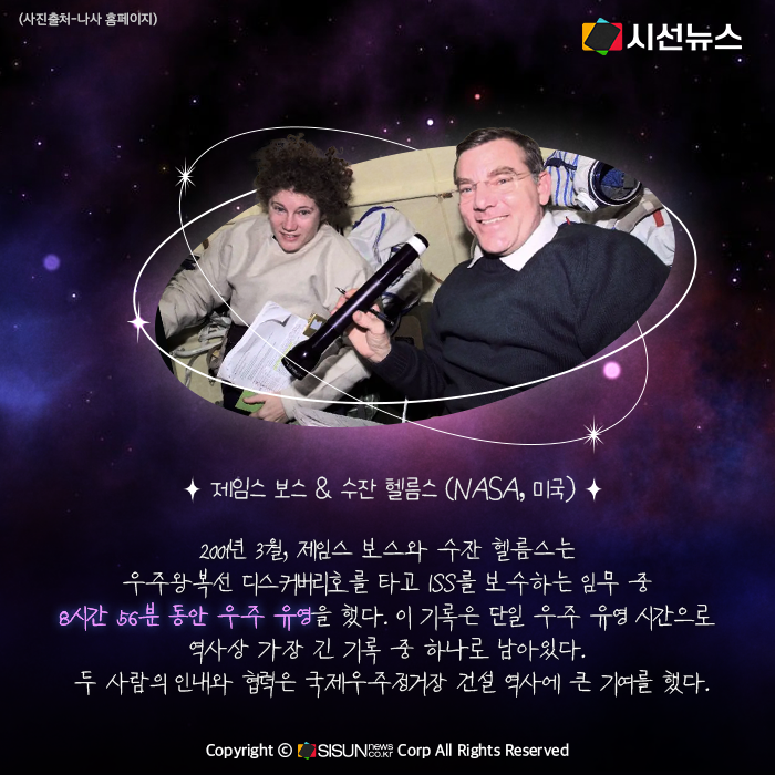 2001년 3월, 제임스 보스와 수잔 헬름스는 우주왕복선 디스커버리호를 타고 ISS를 보수하는 임무 중 8시간 56분 동안 우주 유영을 했다. 이 기록은 단일 우주 유영 시간으로 역사상 가장 긴 기록 중 하나로 남아있다. 두 사람의 인내와 협력은 국제우주정거장 건설 역사에 큰 기여를 했다.