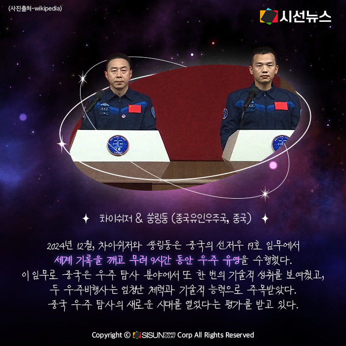 2024년 12월, 차이쉬저와 쑹링둥은 중국의 선저우 19호 임무에서 세계 기록을 깨고 무려 9시간 동안 우주 유영을 수행했다. 이 임무로 중국은 우주 탐사 분야에서 또 한 번의 기술적 성취를 보여줬고, 두 우주비행사는 엄청난 체력과 기술적 능력으로 주목받았다. 중국 우주 탐사의 새로운 시대를 열었다는 평가를 받고 있다.