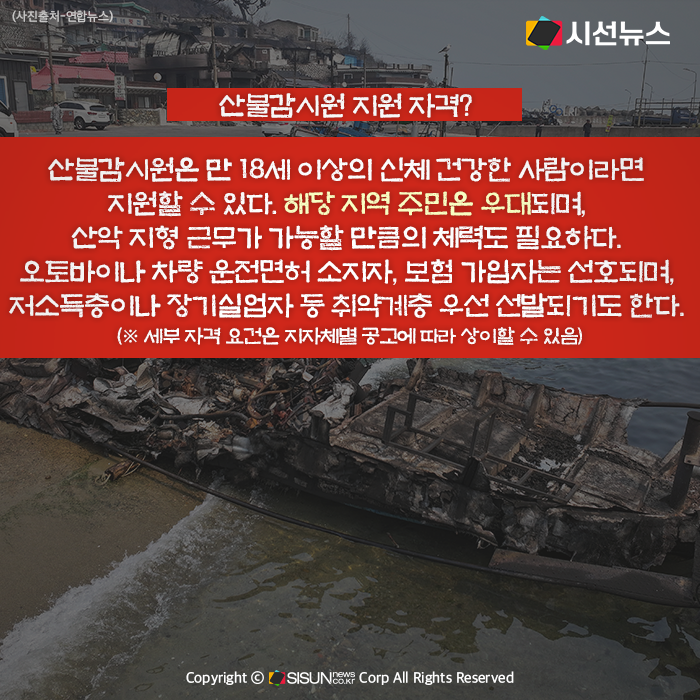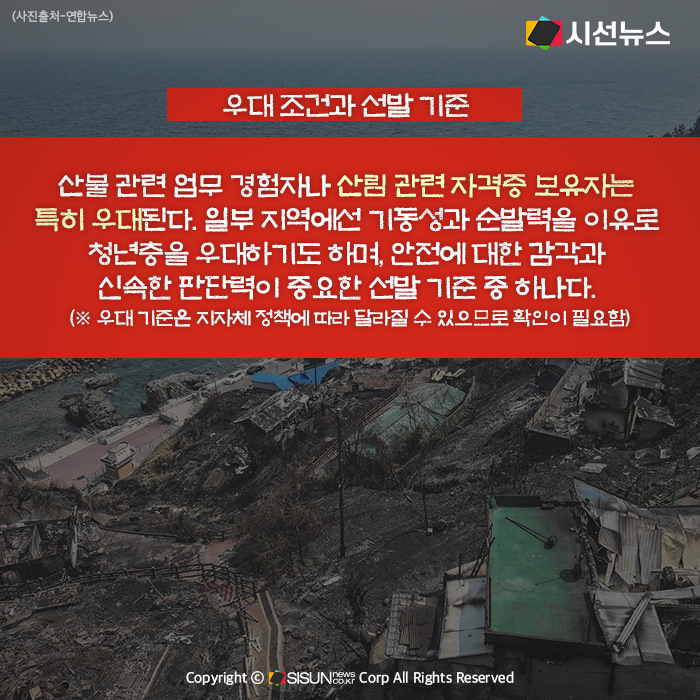 산불 관련 업무 경험자나 산림 관련 자격증 보유자는 특히 우대된다. 일부 지역에선 기동성과 순발력을 이유로 청년층을 우대하기도 하며, 안전에 대한 감각과 신속한 판단력이 중요한 선발 기준 중 하나다. (※ 우대 기준은 지자체 정책에 따라 달라질 수 있으므로 확인이 필요함)