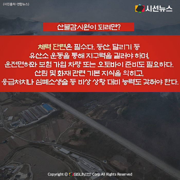 체력 단련은 필수다. 등산, 달리기 등 유산소 운동을 통해 지구력을 길러야 하며, 운전면허와 보험 가입 차량 또는 오토바이 준비도 필요하다. 산림 및 화재 관련 기본 지식을 익히고, 응급처치나 심폐소생술 등 비상 상황 대비 능력도 갖춰야 한다.