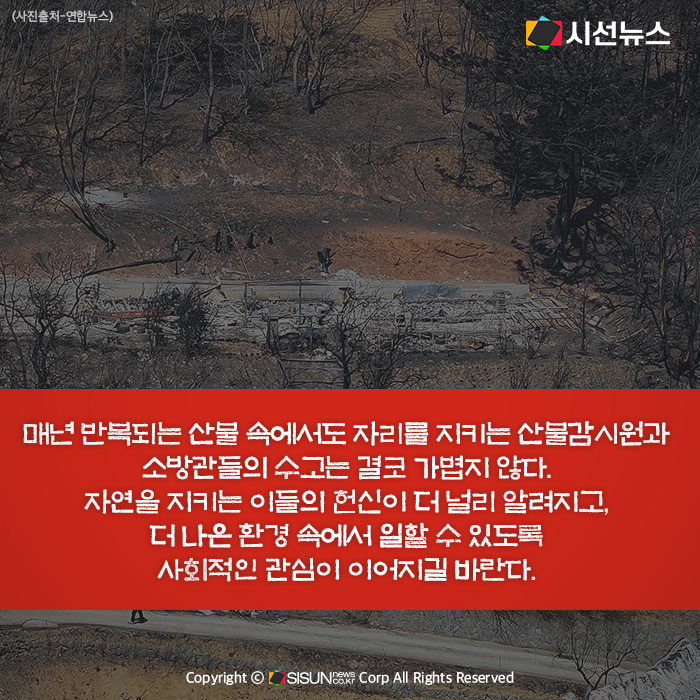 매년 반복되는 산불 속에서도 자리를 지키는 산불감시원과 소방관들의 수고는 결코 가볍지 않다. 자연을 지키는 이들의 헌신이 더 널리 알려지고, 더 나은 환경 속에서 일할 수 있도록 사회적인 관심이 이어지길 바란다. 무엇보다 산불의 위험성을 잊지 않고, 우리 모두 함께 지켜가야 할 때다.